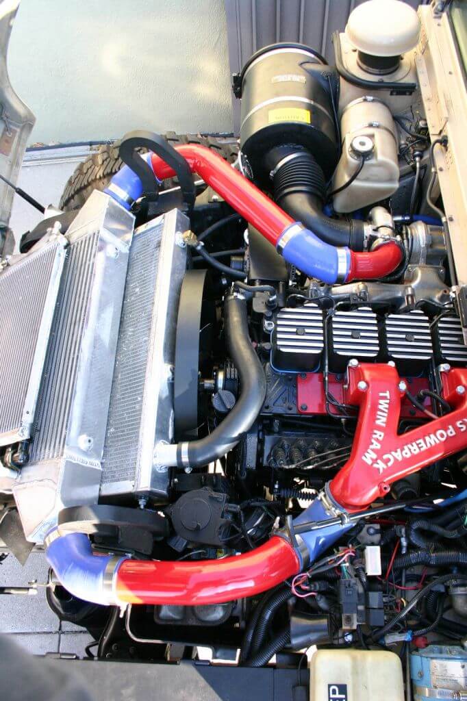 The goal was clear… I wanted more power and drive-ability, while increasing off-road capability and reliability. We would start with a Cummins 6BT 12 Valve mechanical engine with Custom Aluminum Intercoolers and Radiators. This was the obvious choice for a durable and simple high torque engine. Next came the 5-speed Allison transmission, electronically controlled to offer the best overall gear ratios for both the on and off road reliability that I was looking for. An MP2225 Transfer Case was also chosen for its’ beefier components and water cooled design that is used in up-armored HMMWV’s in high heat/desert applications. We decided on a body off rebuild which would eventually include many things that a 20 year old, heavily off-roaded truck would need to address. All new A-arm Bushings are installed. All new custom Cepek designed Adjustable shocks and 17″ Rims mounted with 40″ Good Year Wrangler MTR tires. All new Alpha Style Helical Geared Hubs. A new 12K Driveline is fitted including all new same size Halfshafts (thanks to the Predator custom made front differential centering kit), all new custom designed Driveshafts and CV joints, all new Eaton E-Locker Differentials, and a new 12″ Brake